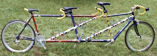 The "Fiesta" paint job is the prodigy of Tailgunner John C. Smith's sister, artist Margaret Lee. We brainstormed several evenings in a lodge at Snow Mountain Ranch in Frasier, Colorado, over Christmas, 1997, developing the final concept. Dave Cimino, an employee of GT Bicycle's R&D Department in Longmont, Colorado, and painter of the US National, Saturn Professional, and US Olympic Team bicycles (to name a few) finished our cromoly canvas with top-quality German-made Sikkens enamel. Dave tells us it's unquestionably the most elaborate bike finishing job he's done, and he's justly proud of the result. One friend from California who saw a picture of the bike commented, "Looked at the 2 + 1 = 3 bicycle on the coupling site. What was the paint scheme I was seeing there? Looked a little psychedelic...the water supply secure in the Boulder area?" We think it reflects the good cheer not just of the riders on her but the smiles and comments of passers-by as well!