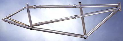Kent Eriksen Cycles tandem frame with S and S Couplings that separates into three sections for airline travel. |