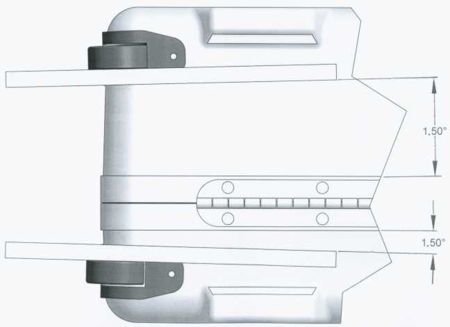If you don't have a way to measure the wheel angle, the gage that is provided here can be printed out then cut to the desired width as a simple means of measuring the 1.5 degree angle. Cut the printout along one of the parallel lines to the desired width to fit the case that you are modifying Hold one edge of the paper gage against the metal case frame and the other side against the wheel. By sliding the wedge shaped gage left or right, it is possible to make both edges of the paper to come into contact at the same time as shown below.